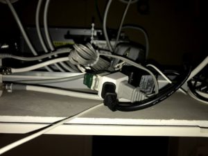 先程のONU端末に接続されていた同軸ケーブルはこちらの5分配器の右中央であるIN端子に接続されています。このケーブルの接続先を変えます。ONU端末→PI電源のアンテナ側に接続替えをします。