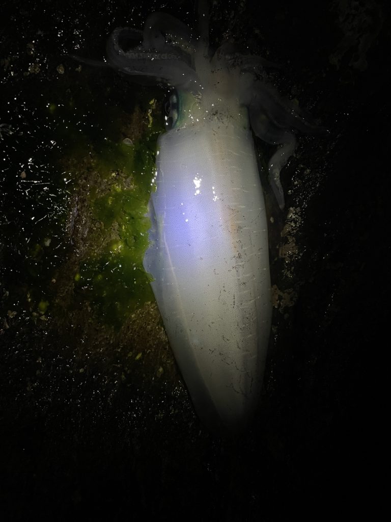 ショッカー殿にタモ入れをお願いし見事、胴長27㎝の大型アオリイカをゲット。