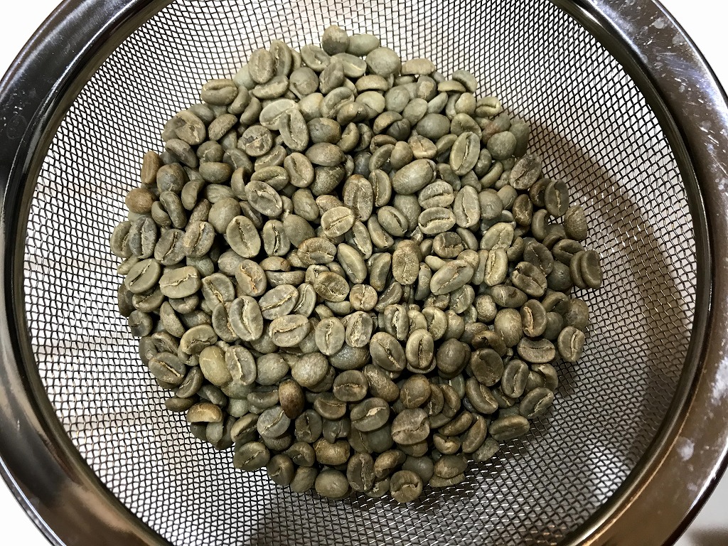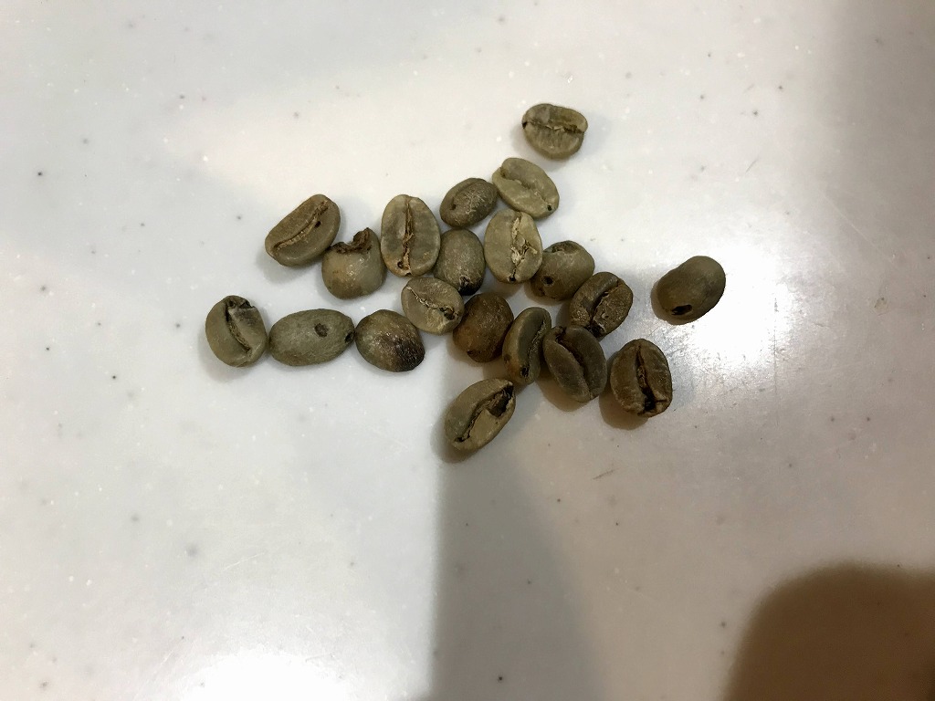 コロンビアスプレモの生豆の状態(まだ、緑色が濃くてフレッシュです。)