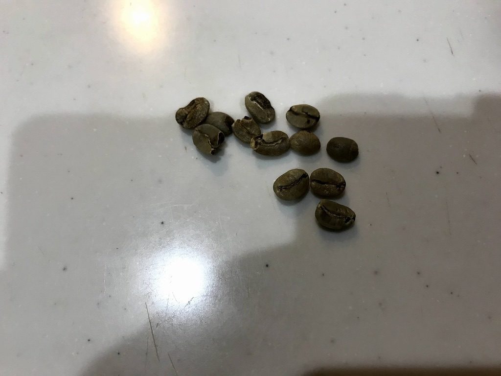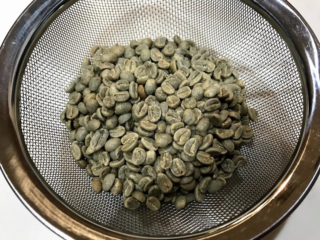 コロンビアスプレモの生豆の状態(まだ、緑色が濃いですね。)