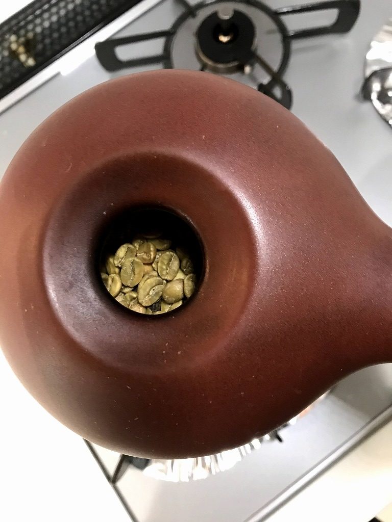 1.予備加熱時:ガスは中火でいるいるとの距離は15㎝。この工程での目的は豆自体の水分を飛ばして生焼けを防止するのと急激な温度上昇によるサーマルショックを緩和させる目的です。